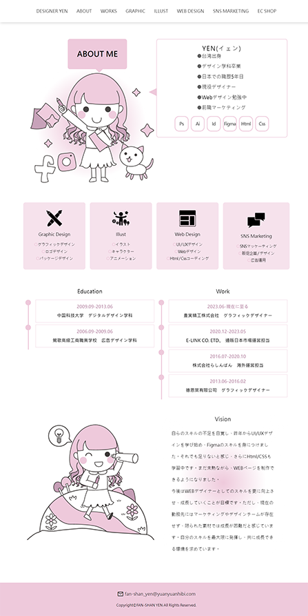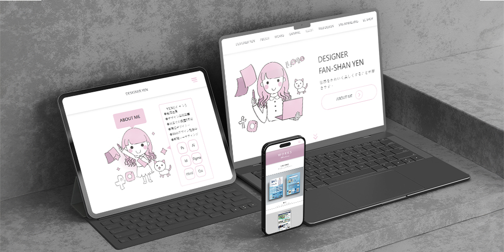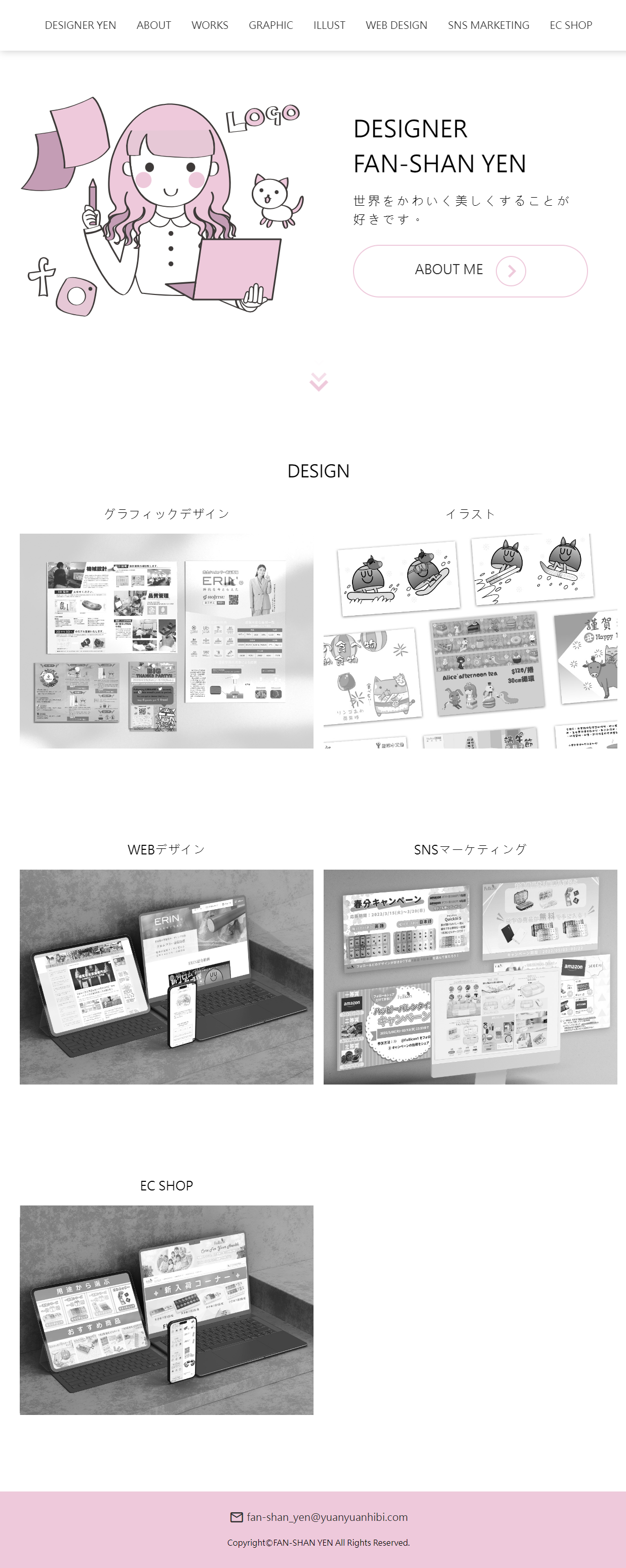 作品がメインですので、ページはシンプルでデザインされ、メインカラーには薄ピンクをベースに、セカンドカラーにはグレイと白を使用しました。