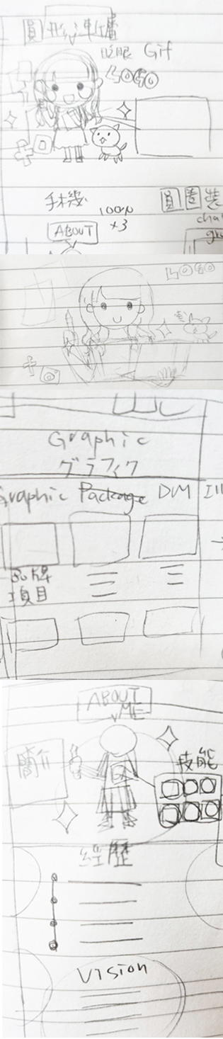 最初の考え方は自分らしいサイトを作りたいと思い、自分の似顔のイラストを描いてから、レイアウトを考えました。